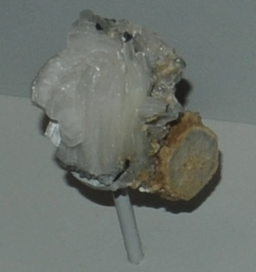 This sample of bertrandite is displayed in the Smithsonian Museum of Natural History. Bertrandite is a silicate of beryllium with the composition Be4Si2O7(OH)2. The sample at left is about 5 cm across and is from Conselheiro Pena, Minas Gerais, Brazil. The sample is described as bertrandite with elbaite, cookeite and lepidolite.