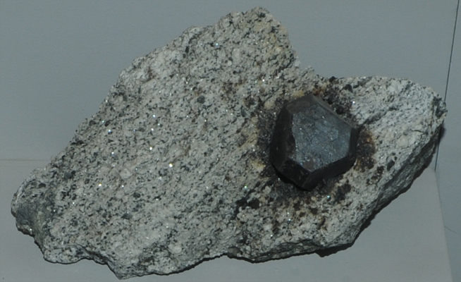 This sample of cafarsite is displayed in the Smithsonian Museum of Natural History. Cafarsite contains titanium, arsenic and manganese with the composition (Ca,Mn)8(Ti,Fe)6.5(AsO3)12.2H2O. The sample at left is about 15 cm across and is from Pizzo Cervandone, Novara, Piemonte, Italy.