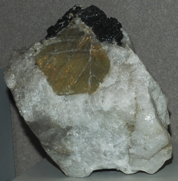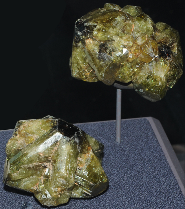 These samples of chrysoberyl are displayed in the Smithsonian Museum of Natural History. Chrysoberyl is an oxide mineral of beryllium with the composition BeAl2O4. The sample at left is about 10 cm across and is from Black Mountain, Rumford, Maine. This sample is described as chrysoberyl with quartz and schorl. A gem-quality variety of chrysoberyl is called Alexandrite.