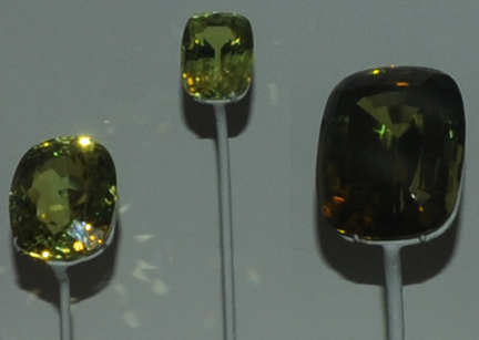 These three chrysoberyl gems are from Minas Gerais, Brazil. They measure 46.3, 13.8 and 114.3 carats.