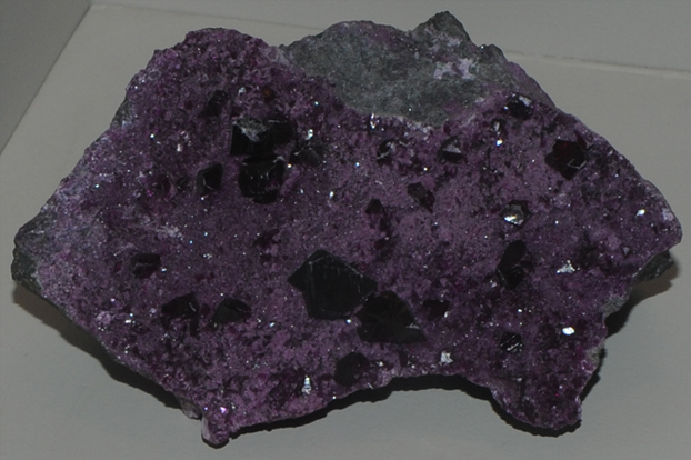 This sample of clinochlore is displayed in the Smithsonian Museum of Natural History. Clinochlore is a mineral that contains four of the big 8 elements of the Earth's crust. The composition is (Mg,Al)6(Si,Al)4O10(OH)8. The sample at left is about 10 cm across and is from Kop chrome mine, Daglari, Anatolia, Turkey. This sample is described as chromian clinochlore, presumably because inclusions of chromium in the chromium mining area contribute the purple color. Other samples of clinochlore have colors from green to blue.