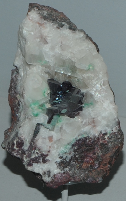 | This sample is about 4x6 cm and is from Tsumeb, Namibia. The green color is an indication of the presence of malachite. The sample is described as cuprite with malachite and calcite.