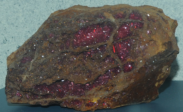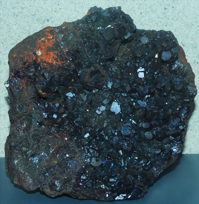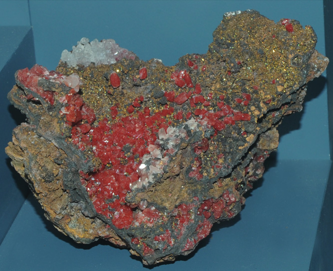 This sample of cuprite is displayed in the Smithsonian Museum of Natural History. Cuprite is an oxide mineral of copper with the composition Cu2O. This sample is about 20 cm wide and is from the Copper Queen mine, Bisbee, Arizona.