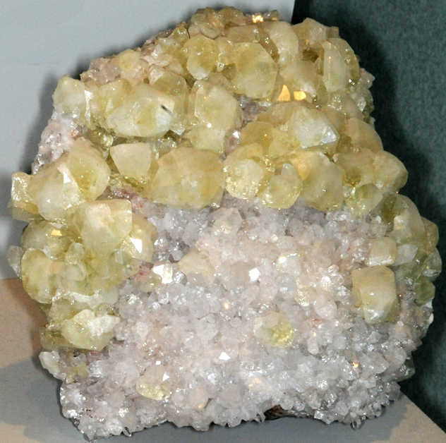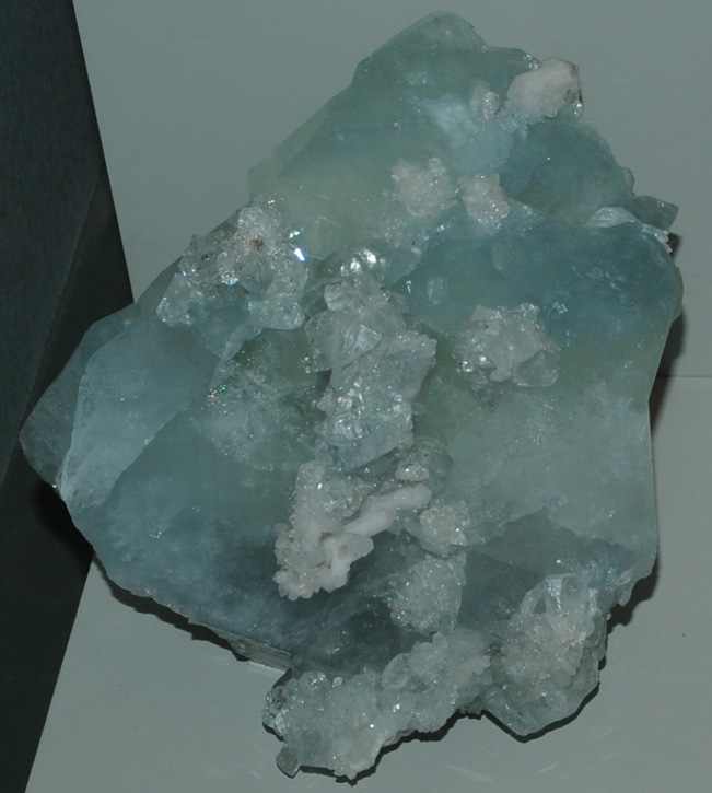 These samples of datolite are displayed in the Smithsonian Museum of Natural History. Datolite is a silicate mineral of boron and calcium with the composition CaBSiO4(OH). The sample at left is about 12 cm across and is described as datolite with quartz.