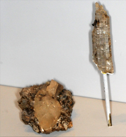 This sample of epididymite is displayed in the Smithsonian Museum of Natural History. Epididymite is a silicate mineral of beryllium and sodium with the composition Na2Be2Si6O15.H2O. The samples at left are from Narsarsuuk, Tunugdliarfik, Greenland. The sample far left is about 3x3 cm.