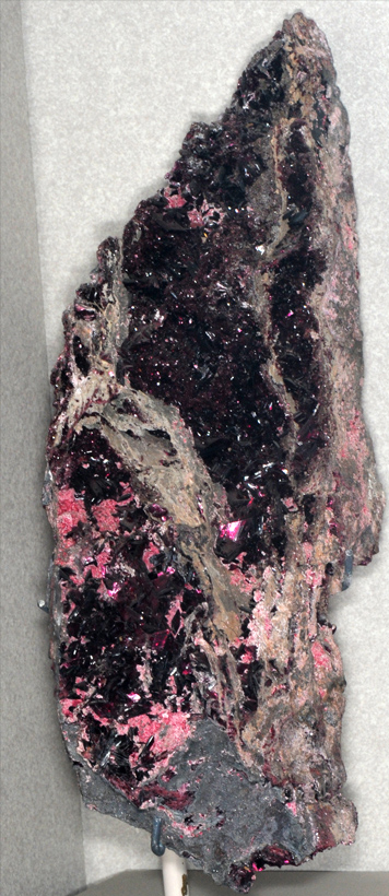 This sample of erythrite is displayed in the Smithsonian Museum of Natural History. Erythrite is an arsenate of cobalt with the composition Co3(AsO4)2.8H2O. This sample is described as erythrite with roselite. It is about 8x20 cm and is from Bou Azzer, Morroco.