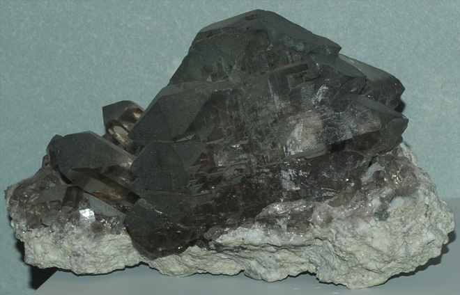 These samples of gwendel quartz are displayed in the Smithsonian Museum of Natural History. Gwendel is a variety of quartz , which has the composition SiO2. The sample at left is about 20 cm across and is from Tiefengletscher, Furka, Uri, Switzerland.