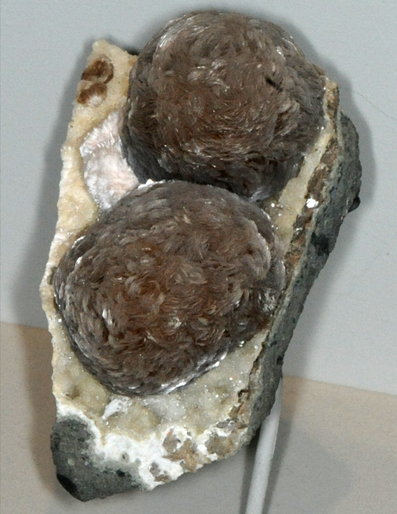 This sample of gyrolite is displayed in the Smithsonian Museum of Natural History. Gyrolite is a silicate mineral with the composition NaCa16AlSi24O60(OH)8.14H2O. The sample at left is about 6 x 8 cm across and is from Bombay, Maharashtra, India. It is described as gyrolite with mesolite and calcite.