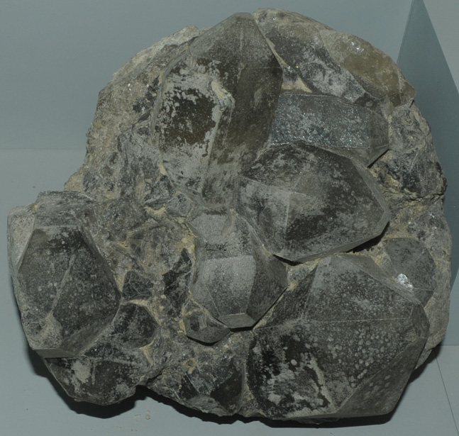 This sample of hanksite is displayed in the Smithsonian Museum of Natural History. Hanksite is a has the composition KNa22(SO4)9(CO3)2Cl. The sample at left is about 20 cm across and is from Searles Lake, San Bernadino County, California.