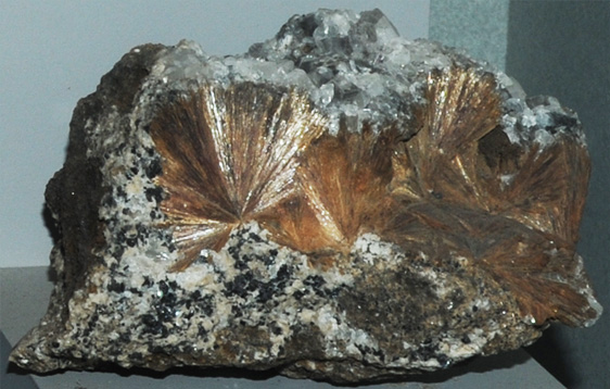 This sample of inesite is displayed in the Smithsonian Museum of Natural History. Inesite is a silicate mineral with the composition Ca2Mn7Si10O28(OH)2.5H2O. The sample at left is about 20 cm across and is from Broken Hill, New South Wales, Australia. It is described as inesite with apophyllite.