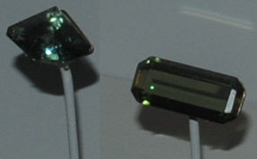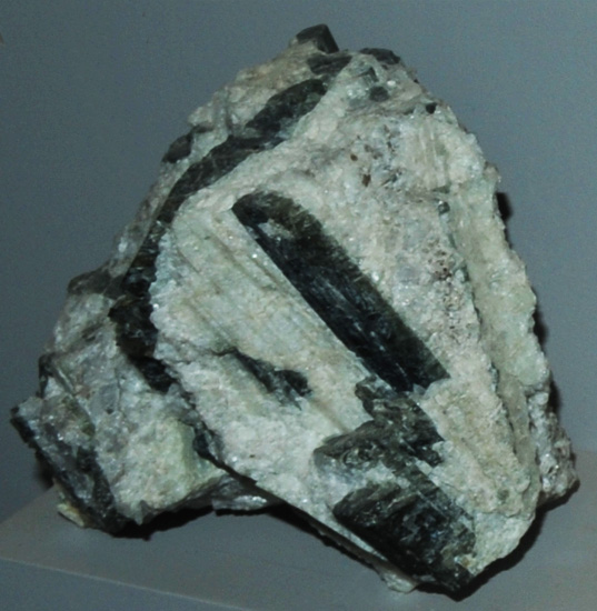 This sample of kornerupine is displayed in the Smithsonian Museum of Natural History. Kornerupine is a silicate mineral which contains boron as well as aluminum and magnesium. It has the composition Mg4Al6(Si,Al,B)5O21(OH). The sample at left is about 12 cm across and is from Oure Mississippi, Fiskernies district, Greenland.