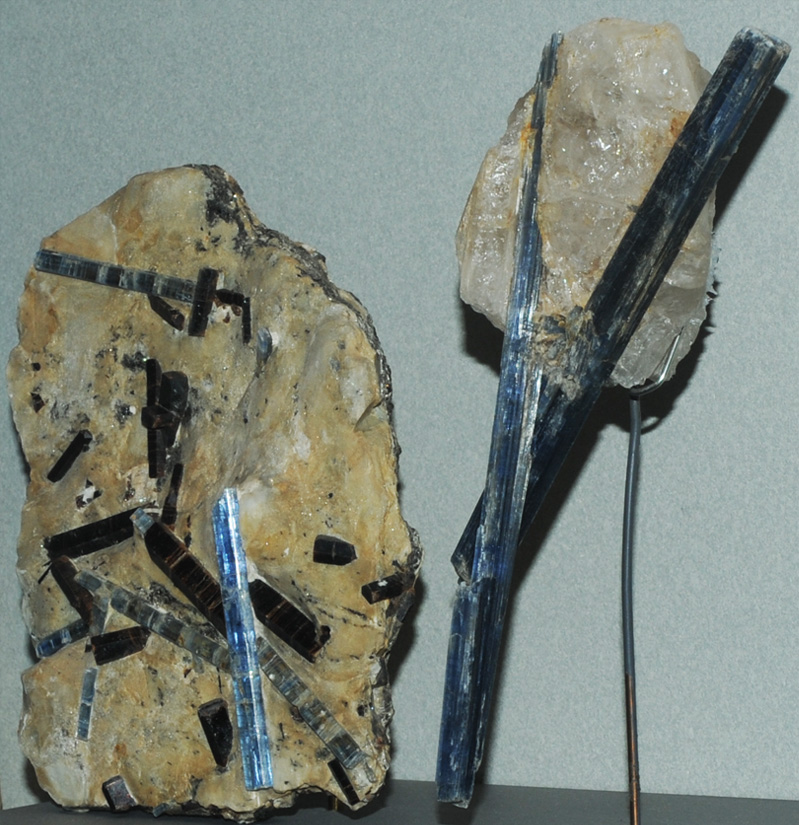 The sample at left is kyanite with quartz and it is from Sao Jose da Safira, Minas Gerais, Brazil. It is about 15 x 40 cm.