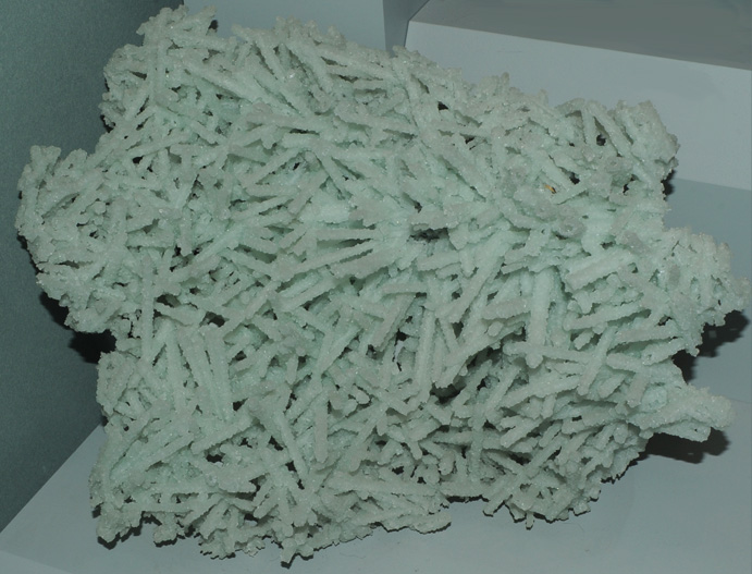 This sample is prehnite formed after laumontite and is displayed in the Smithsonian Museum of Natural History. Laumontite is a silicate mineral with the composition CaAl2Si4O12.4H2O. This sample of prehnite is from Bombay, Maharashtra, India. It is about 20 cm wide and is described as prehnite after laumontite. An image of laumontite was not obtained, but laumontite is an alumino-silicate like prehnite, and it easy to envision laumontite being replaced by prehnite as conditions changed in the location.