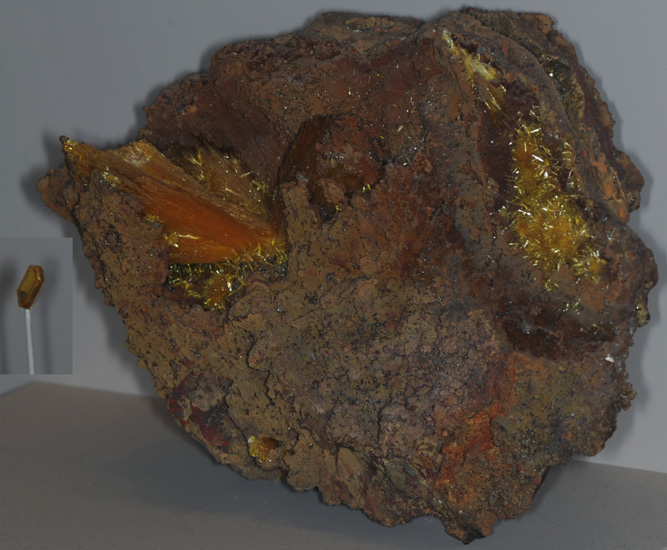 This sample of legrandite is displayed in the Smithsonian Museum of Natural History. Legrandite is a oxide mineral of zinc and arsenic (an arsenate) with the composition Zn2AsO4(OH).H2O. The sample at left is about 18 cm across and is from Ojeula mine, Mapimi, Durango, Mexico. The inset gem is 3.4 caras and is from the same location.