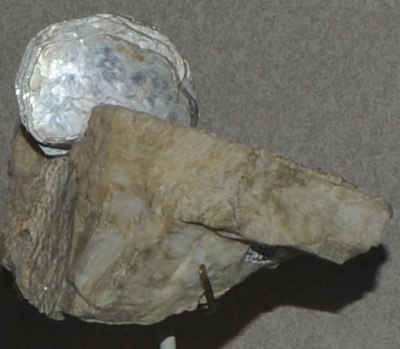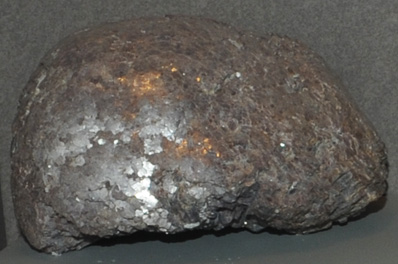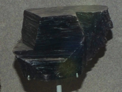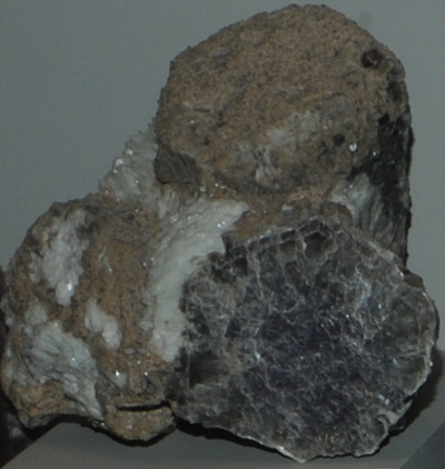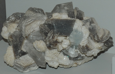 This sample of lepidolite is displayed in the Smithsonian Museum of Natural History. Lepidolite is a silicate mineral which contains lithium, potassium and fluorine. The composition is K(Li,Al)3(Si,Al)4O10(F,OH)2. The sample at left is about 15 cm across and is from Virgem de Lapa, Minas Gerais, Brazil. It is described as lepidolite with microcline.