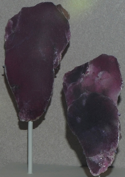 This sample is from Brown Derby pegmatite, Gunnison County, Colorado. Each piece is about 10 cm wide. They show the purple color from manganese content.
