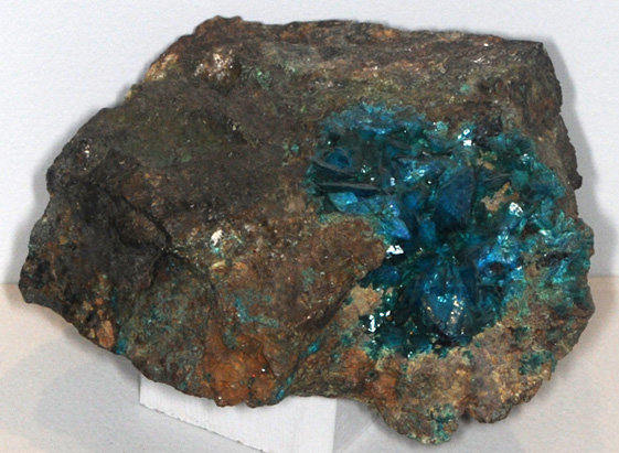 This sample of liroconite is displayed in the Smithsonian Museum of Natural History. Liroconite is an arsenate which contains copper and aluminum with the composition Cu2Al(AsO4)(OH)4.4H2O. The sample at left is about 5x6 cm and is from Gwennap, Cornwall, England.