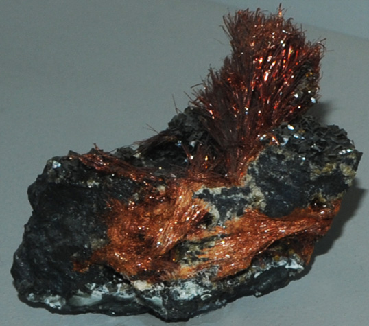 This sample of ludlockite is displayed in the Smithsonian Museum of Natural History. Ludlockite contains iron, lead and arsenic with the composition (Fe,Pb)As2O6. This sample is about 4 x 8 cm and is from Tsumeb, Namibia. It is described as ludlockite with smithsonite. Bright orange is the typical color for ludlockite.