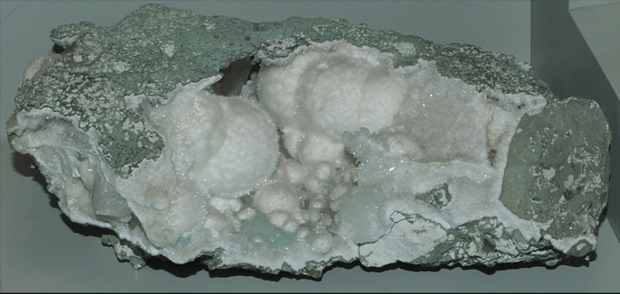 These samples of okenite are displayed in the Smithsonian Museum of Natural History. Okenite is a silicate mineral of calcium with the composition Ca10Si18O46.18H2O. The sample above is about 25 cm across and is from Bombay, Maharashtra, India.