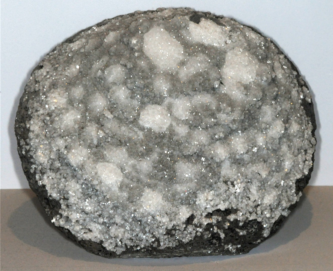 This sample of Phillipsite is displayed in the Smithsonian Museum of Natural History. Phillipsite is a silicate mineral of calcium, potassium and sodium. As an aluminum silicate, it is part of the zeolite group. The composition of this sample is listed as K(Ca0.5,Na)2(Si5Al3)O16.6H2O. Sometimes Phillipsite is indicated with suffix -K, -Ca, -Na, depending upon which ion is dominant. This specimen is about 16 cm wide and is from Richmond, Victoria, Australia.