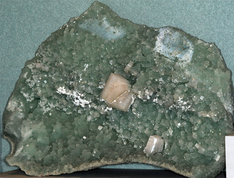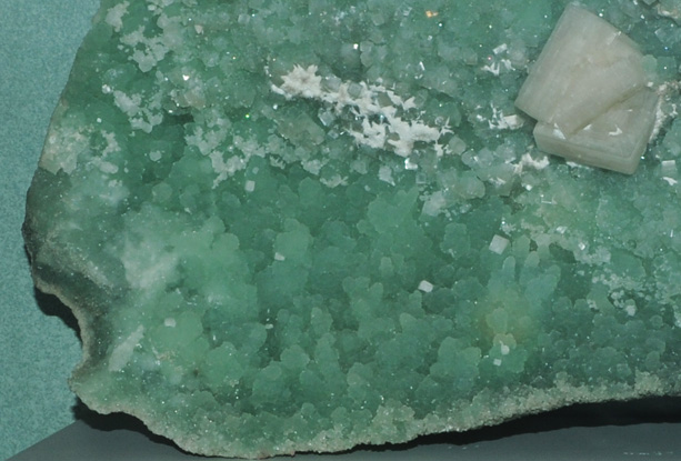 | This large sample is from Khandivalli quarry, Bombay, Maharashtra, India. It is described as prehnite with gyrolite and fluorapophylite. It is probably about 25 x 40 cm.