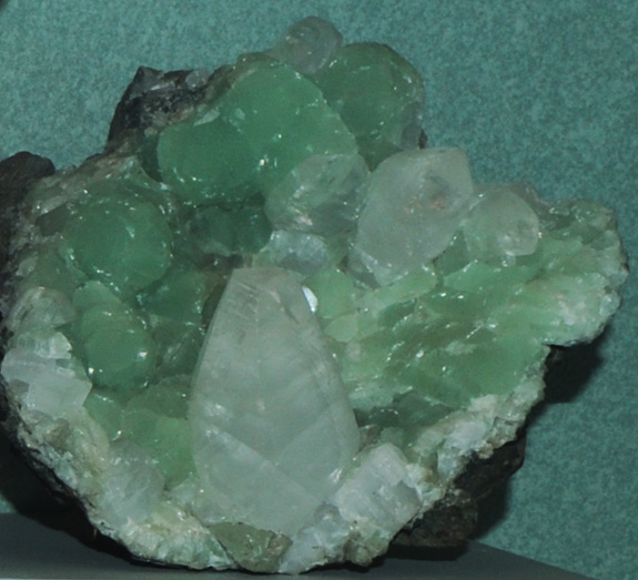 | This is about one quarter of the prehnite sample above that is about 40 cm across and is from Fairfax quarry, Centreville, Virginia. It is described as prehnite with fluorapophyllite.