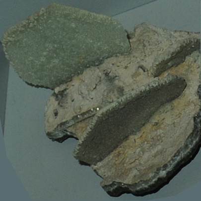 | This prehnite sample is about 15 cm across and is from Prospect Park, New Jersey. It is described as prehnite with calcite.