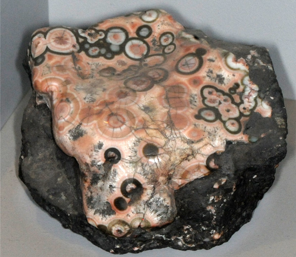 This sample of Thomsonite is displayed in the Smithsonian Museum of Natural History. Thomsonite is classified as part of the zeolite group of silicate minerals, containing 5 of the Big 8 elements. It has the composition NaCa2(Al5Si5)O20.6H2O This sample is about 12x5 cm and is from Grand Marais, Minnesota.