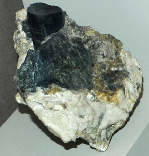 This sample of triphylite is displayed in the Smithsonian Museum of Natural History. Triphylite is a phosphate mineral of lithium and iron. It has the composition LiFePO4. This sample is about 11x12 cm and is from Smith mine, Chandler's Mills, New Hampshire.
