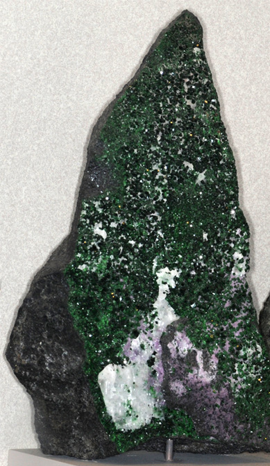 This sample of uvarovite is displayed in the Smithsonian Museum of Natural History. Uvarovite is a silicate of chromium and calcium with the composition Ca3Cr2(SiO4)3. The sample at left is about 12x20 cm and is from Saranovskoe chromite deposit, Nizhniy Tagil, Urals, Russia.