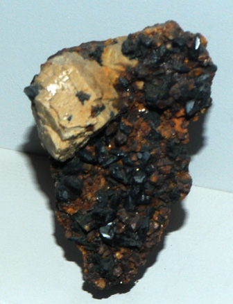 This sample of Whiteite is displayed in the Smithsonian Museum of Natural History. Whiteite refers to a phosphate mineral of multiple metal ions. The term Whiteite is currently used in the sense of a Whiteite group. This particular sample contains calcium, iron, manganese, magnesium and aluminum. Its composition is given as Ca(Fe,Mn)Mg2Al2(PO4)4(OH)2.8H2O. The sample at left is about 5x7 cm and is from Rapid Creek, Yukon Territory, Canada.