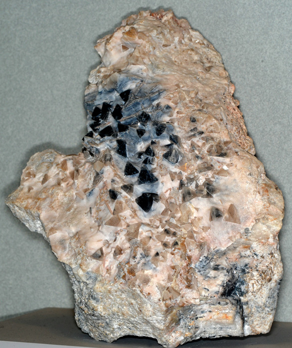 This sample of zunyite is displayed in the Smithsonian Museum of Natural History. Zunyite is an silicate mineral of aluminum which contains fluorine and chlorine. It has the composition Al13Si5O20(OH,F)18Cl. This sample is about 14x17 cm and is from Electric Meatball mine, Quartzite, Arizona.