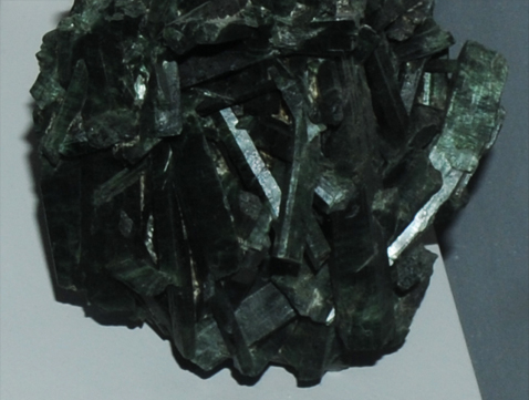 Actinolite is a silicate with composition Ca2(Mg,Fe)5Si8O22(OH)2, all big-8 elements except hydrogen. The sample above is about 11x40 cm and is from Sears Creek, Wenatchee, National Forest, Washington. It tends to form in long, thin crystals. These samples are displayed in the Smithsonian Museum of Natural History.
