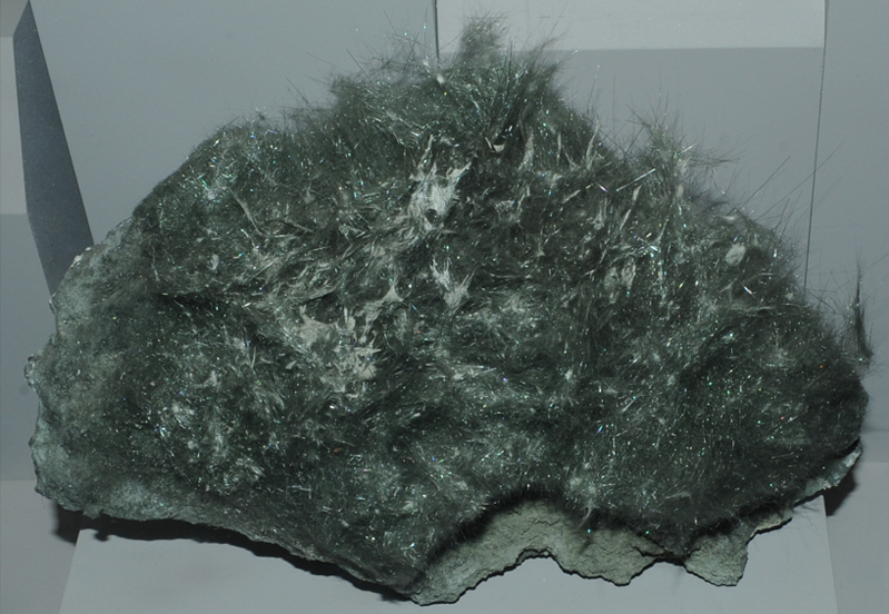 This sample of actinolite has a very different appearance, forming in a fibrous mass. The sample is about 18x16 cm and is from Fairfax quarry, Centreville, Virginia. It has an appearance similar to those magnesium silicates which are collectively labeled "asbestos".