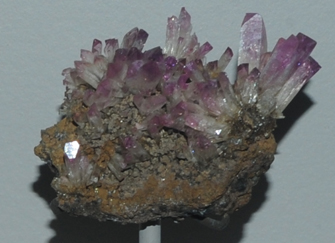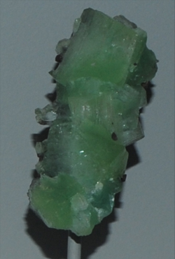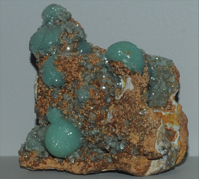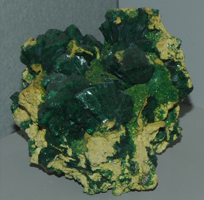 These samples of adamite are displayed in the Smithsonian Museum of Natural History. Adamite is an oxide which contains zinc and arsenic with the composition Zn2AsO4(OH). It is classified as part of the olivenite group as an arsenate. This sample is about 6x6 cm and is from Tsumeb, Namibia. It is classified as cuprian adamite because of the copper content.