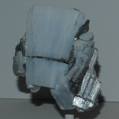 These samples of anhydrite are displayed in the Smithsonian Museum of Natural History. Anhydrite is a sulfate mineral of calcium with the composition CaSO4. The sample at left is about 5 cm across and is from Naica, Chihuahua, Mexico.