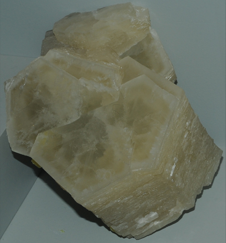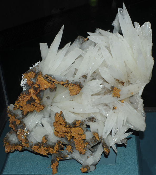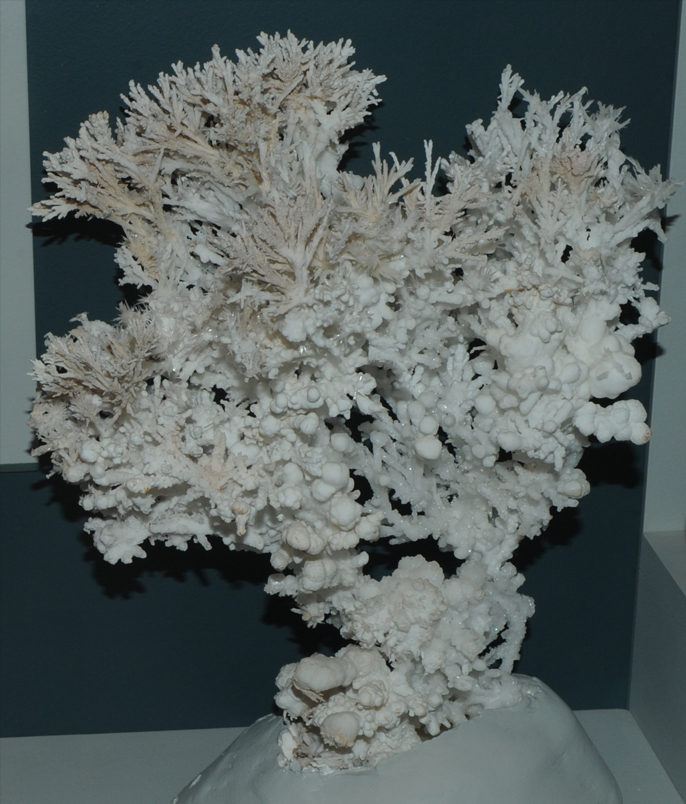 This sample of Aragonite is displayed in the Smithsonian Museum of Natural History. Aragonite is a carbonate mineral which contains calcium with the composition CaCO3. This sample is about 6x6 cm and originated in La Pesquera, Castilla la Mueva, Cuenca, Spain.