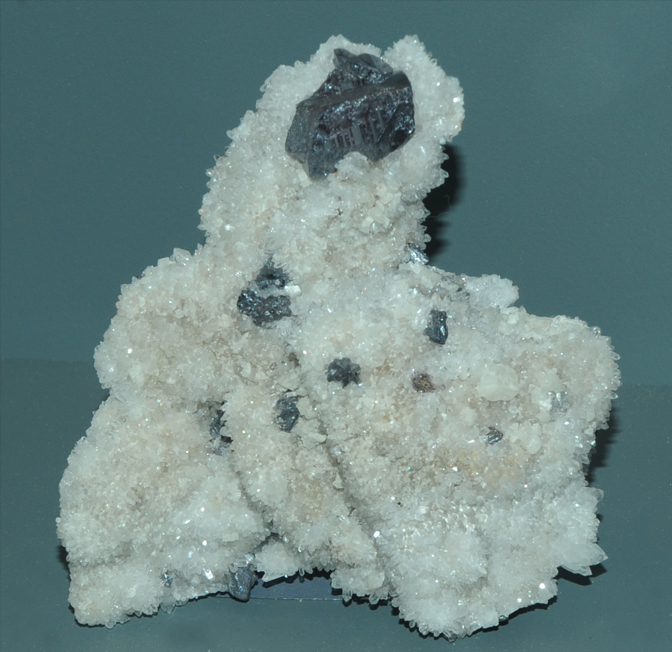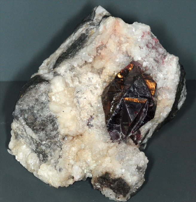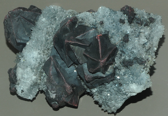 This sample is cinnabar with quartz and dolomite. The sample is about 10 cm wide and is from Hunan, China. It includes one large, twinned cinnabar crystal and several smaller ones, all dark red. Cinnabar is the major ore of mercury.