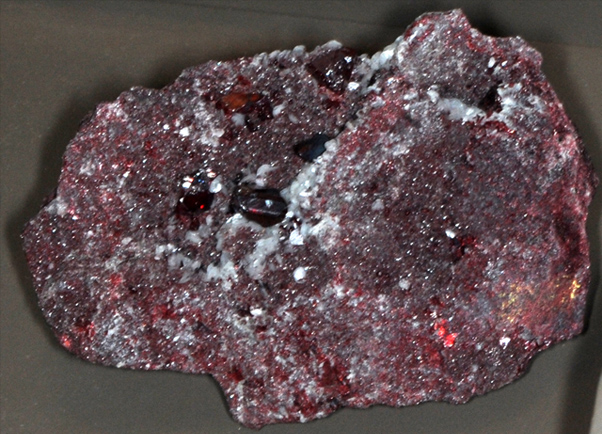 These samples of cinnabar are displayed in the Smithsonian Museum of Natural History. Cinnabar is a sulfide mineral of mercury with the composition HgS. The sample at left is about 12 cm across and is from Castilla la Nue, Ciudad Real, Almaden, Spain.