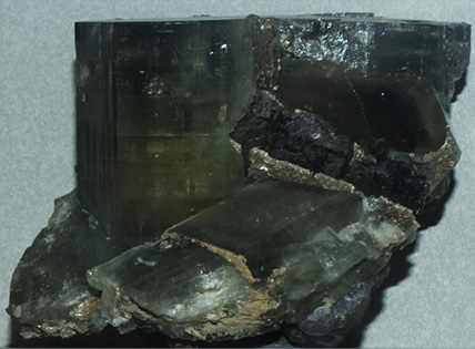 The largest of the fluorapetite crystals at right is about 2.5 x 9 cm.