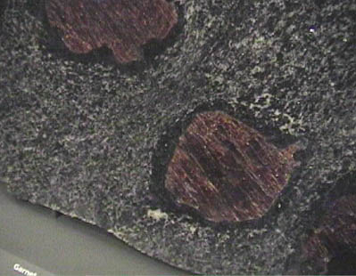 This sample is described as garnet amphibolite. It has inclusions of garnet which are 10-12 cm across. The sample is on display in the Smithsonian Museum of Natural History.