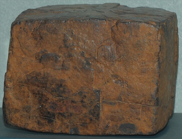 This goethite sample was formed after pyrite when chemical conditions changed. It retains the pyrite's basic cubic shape, so it is a pseudomorph. Pyrite is an iron sulfide, and goethite is an iron oxide hydroxide.