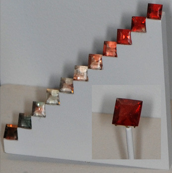 Labradorite exhibits a wide range of gem colors as shown in this display at the Smithsonian Museum of Natural History. The larger gem is 3.2 carats and the collection of smaller gems are 1.7 carat. They are from Oregon.
