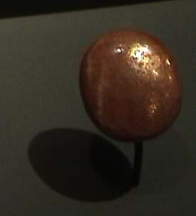 Oligoclase is a silicate with composition (Na,Ca)(Si,Al)4O8. This 12.6 carat gem is of variety "sunstone" and is from Bjordam Farm, Telemark, Norway. The sample is on display at the Smithsonian Museum of Natural History.