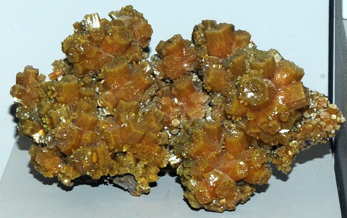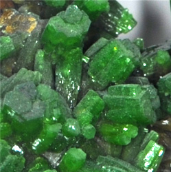 Pyromorphite is a phosphate of lead with the composition Pb5(PO4)3Cl. This sample is about 8x10 cm and is from Les Farges mine, Ussel, Correze, France. This sample is on display at the Smithsonian Museum of Natural History.