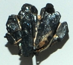 This sample of samarskite is displayed in the Smithsonian Museum of Natural History. Samarskite is an oxide mineral which contains uranium, cerium, yttrium, niobium, tantalum and titanium. It has the composition (Y,Ce,U,Fe)3(Nb,Ta,Ti)5O16. This sample is about 5x5 cm and is from Webb mine, Yancy County, North Carolina.