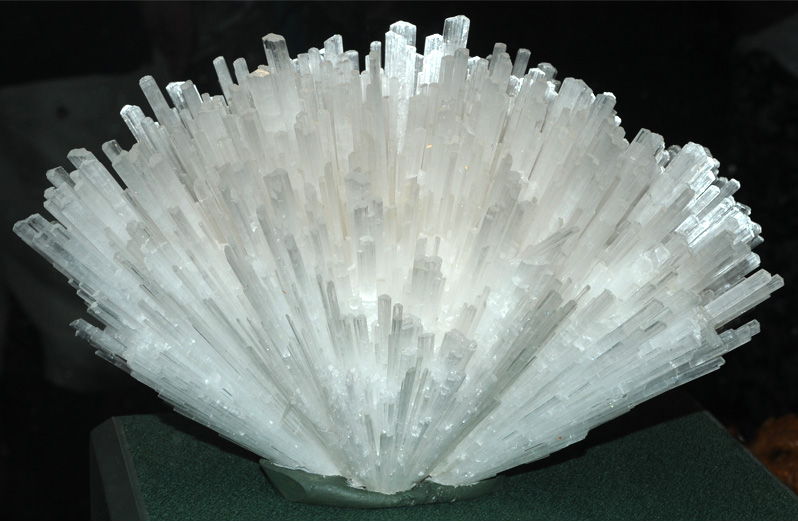 Scolecite![]() This large sample of scolecite is displayed in the Smithsonian Museum of Natural History. It is about 50 cm across and is from Nasik, Maharashtra, India. Each elongated needle is a crystal whose shape reflects the chainlike arrangement of its atoms. The cluster grew from a water solution that filled a gas bubble in cooled volcanic rock. Workers discovered it while quarrying. Scolecite is a silicate mineral with the composition CaAl2Si3O10.3H2O