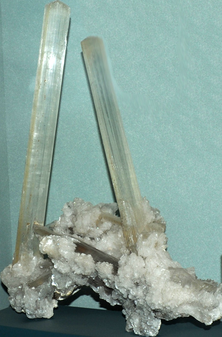 These samples of selenite are displayed in the Smithsonian Museum of Natural History. Selenite is a name given to clear crystals of gypsum, as contrasted with the milky, translucent gypsum that usually forms as evaporative deposits. The name comes from the Greek selene, meaning "moon", a reference to the whitish reflections off the crystal faces. Selenite exhibits beautiful crystals, but they are too soft to be considered as gemstones.