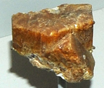 This sample of simpsonite is displayed in the Simpsonite Museum of Natural History. Simpsonite is an oxide mineral of aluminum which contains tantalum and niobium. It also contains fluorine. It has the composition Al4(Ta,Nb)3O13(F,OH). This sample is about 3x3 cm and is from Alto do Giz mine, Equador, Rio Grande do Norte, Brazil.