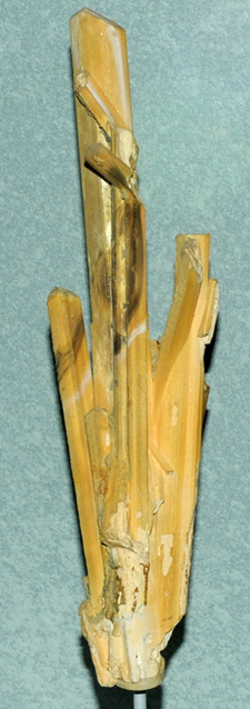 This sample of stibiconite is displayed in the Smithsonian Museum of Natural History. Stibiconite is a oxide mineral of antimony. It has the composition Sb6O6(OH). This sample of stibiconite at left is about 5x25 cm and is from Catorse, San Luis Potosi, Mexico. The sample is described as being "after stibnite" since it has the characteristic shape of stibnite, shown at right, indicating that the oxidation took place following the sulfide stibnite by replacing the sulfur with oxygen.